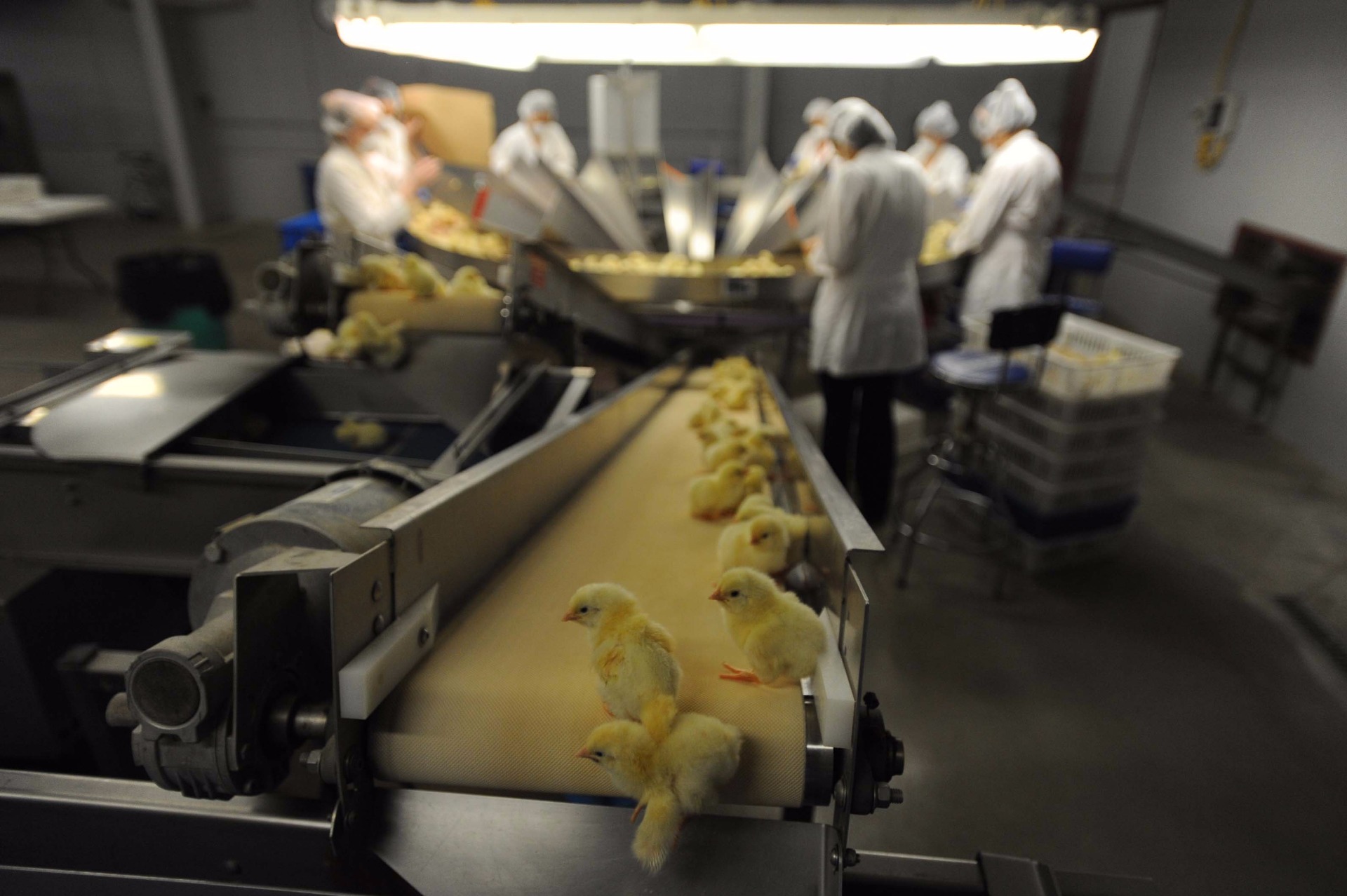 After being inspected for health and sorted by sex, chicks are sent down a conveyer belt and loaded into crates.